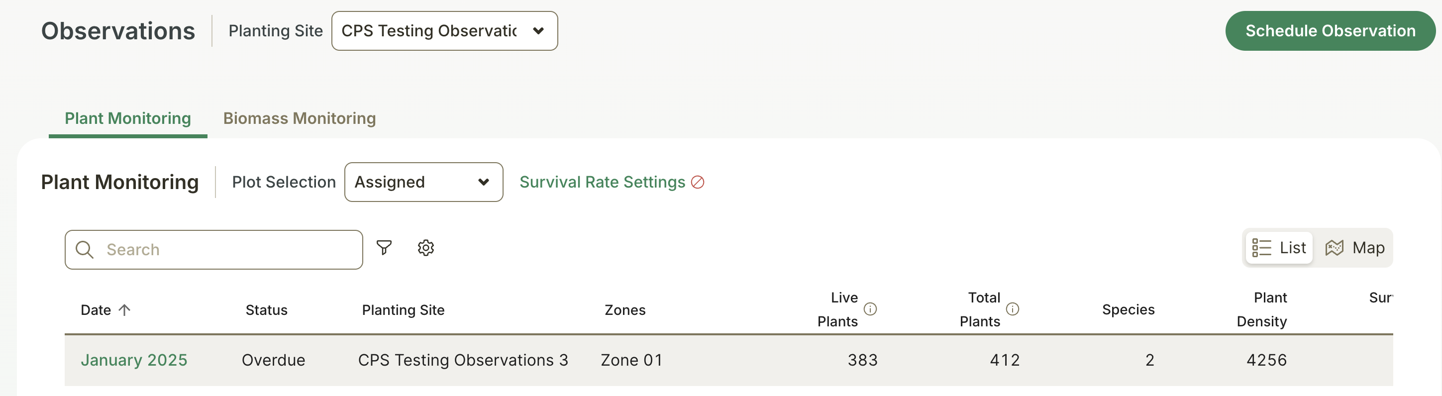 Terraware calculates Survival Rates for Planting Sites based on initial plant densities and subsequent live and dead counts of plants observed during Assigned Plot Plant Monitoring Observations. These Survival Rates are calculated and shown in Observations at the Planting Site, Stratum, and monitoring plot levels. Survival Rates will also be shown in the Plants Dashboard.