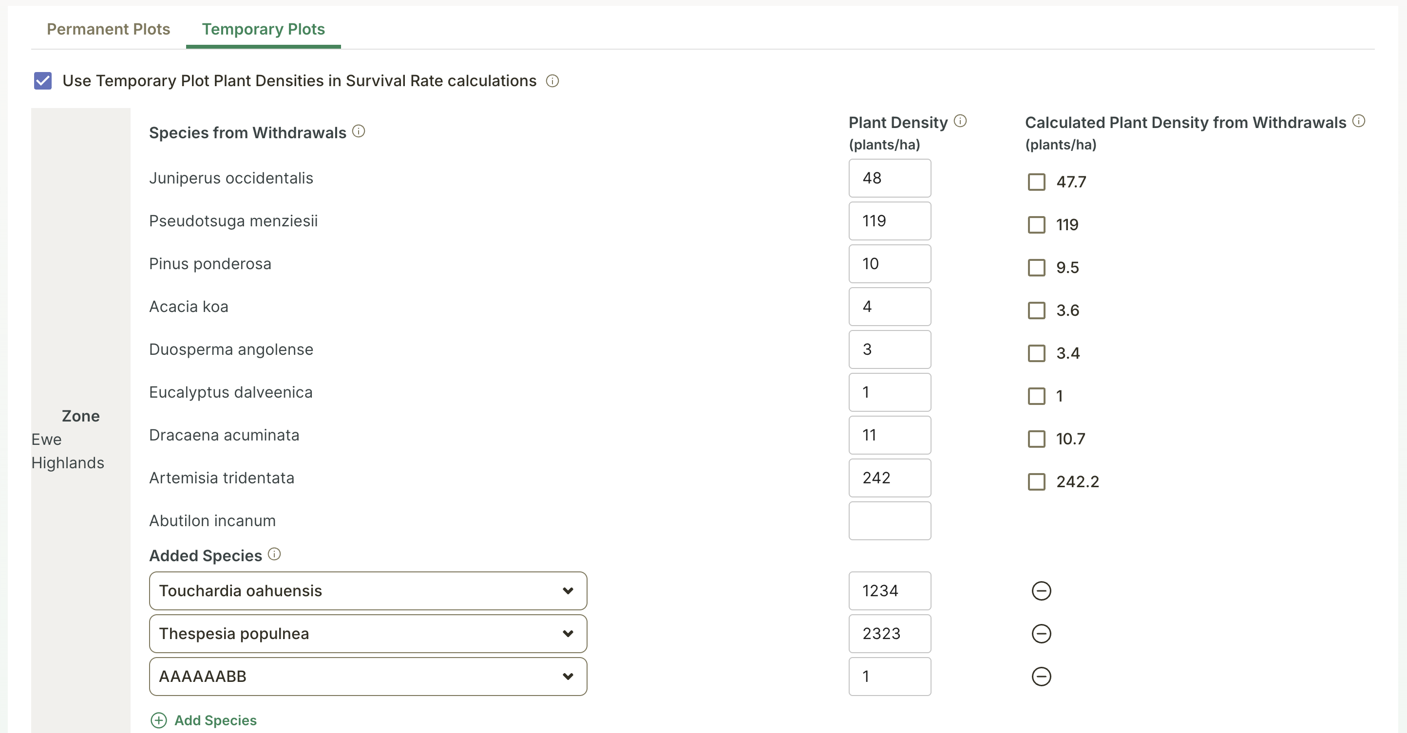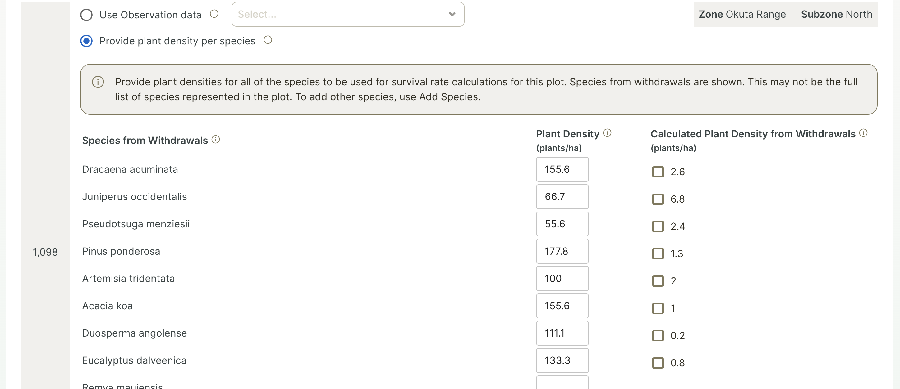 For every species, either enter a number for the Plant Density or select to use the calculated plant density from withdrawals. The densities in the Calculated Plant Density from Withdrawals reflect the densities of the species as of the latest planting withdrawal to the substratum in which the plot is located. When new planting withdrawals are made to the substratum, the density will be updated, and any new species planted will be newly listed. When new species are listed, the densities to use for t0 data will need to be set in order for Survival Rates to be calculated.