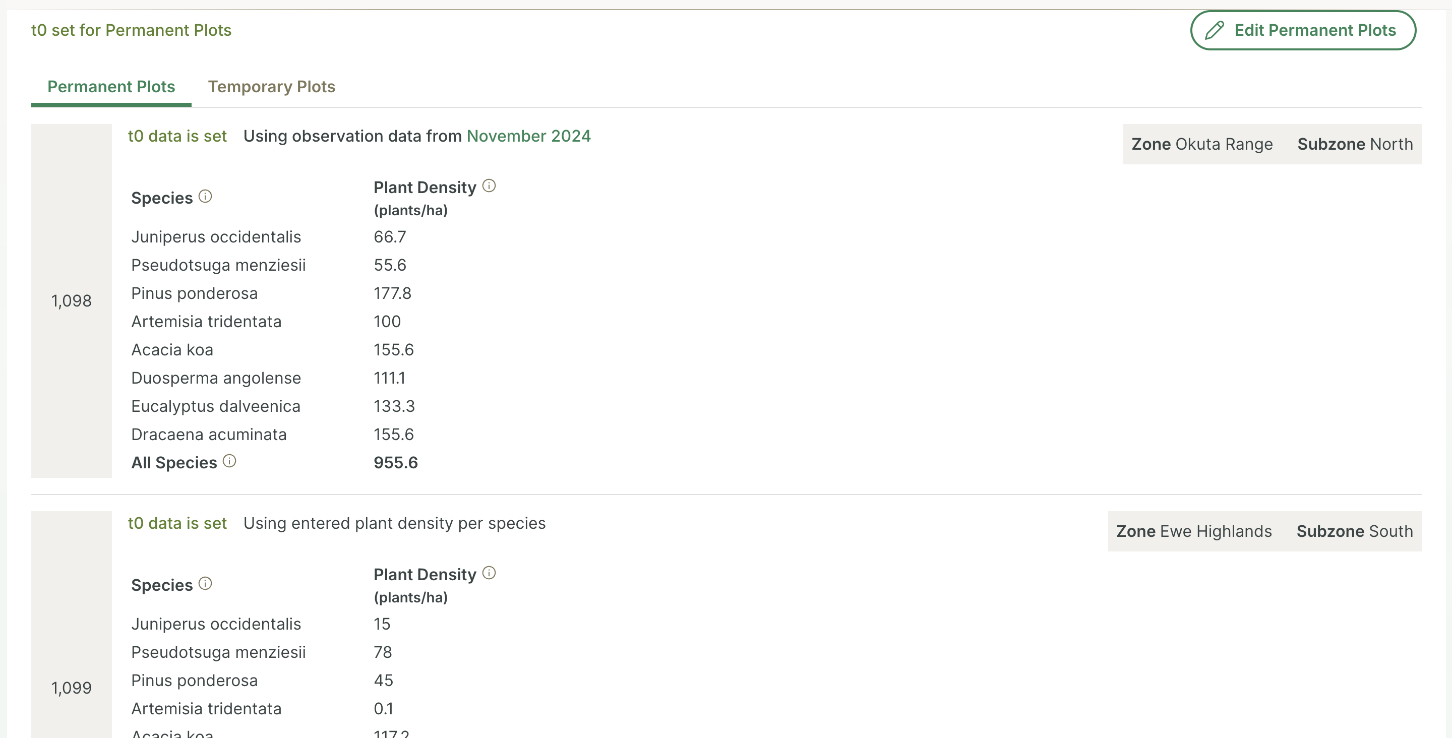 Completed Observations that include a permanent plot can be used for the permanent plot’s t0 data. Ideally, the data in the first Observation completed for the Planting Site, conducted right after planting has been completed, is used as t0 data.