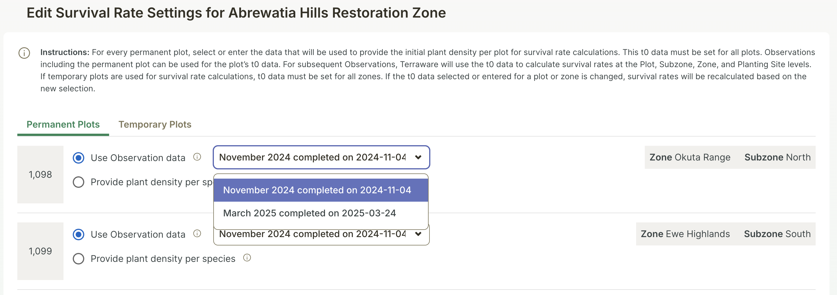 In order for Terraware to calculate Survival Rates for Planting Sites, the initial plant densities will need to be set for each permanent plot and/or for each Planting Site Stratum for temporary plots for the Planting Site. The plant densities for these permanent plots and temporary plots can be set once there is a completed Observation for the Planting Site. The status of the Observation must be "Completed" or "Completed (Ended)."
