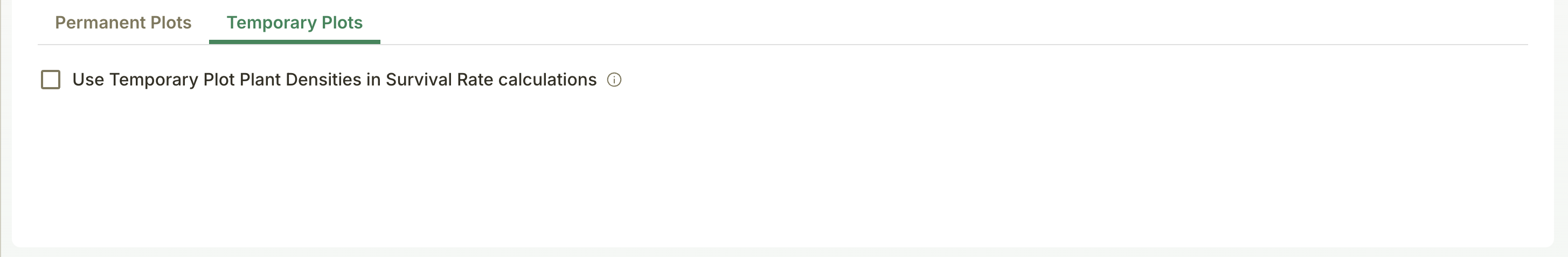 To use temporary plots in Survival Rate calculations, you will need to select the option in the Temporary Plots tab in the Survival Rate Settings page. Check the box to include temporary plots in Survival Rate calculations. Uncheck the box to exclude temporary plots. Survival Rates will be recalculated any time the setting is changed.